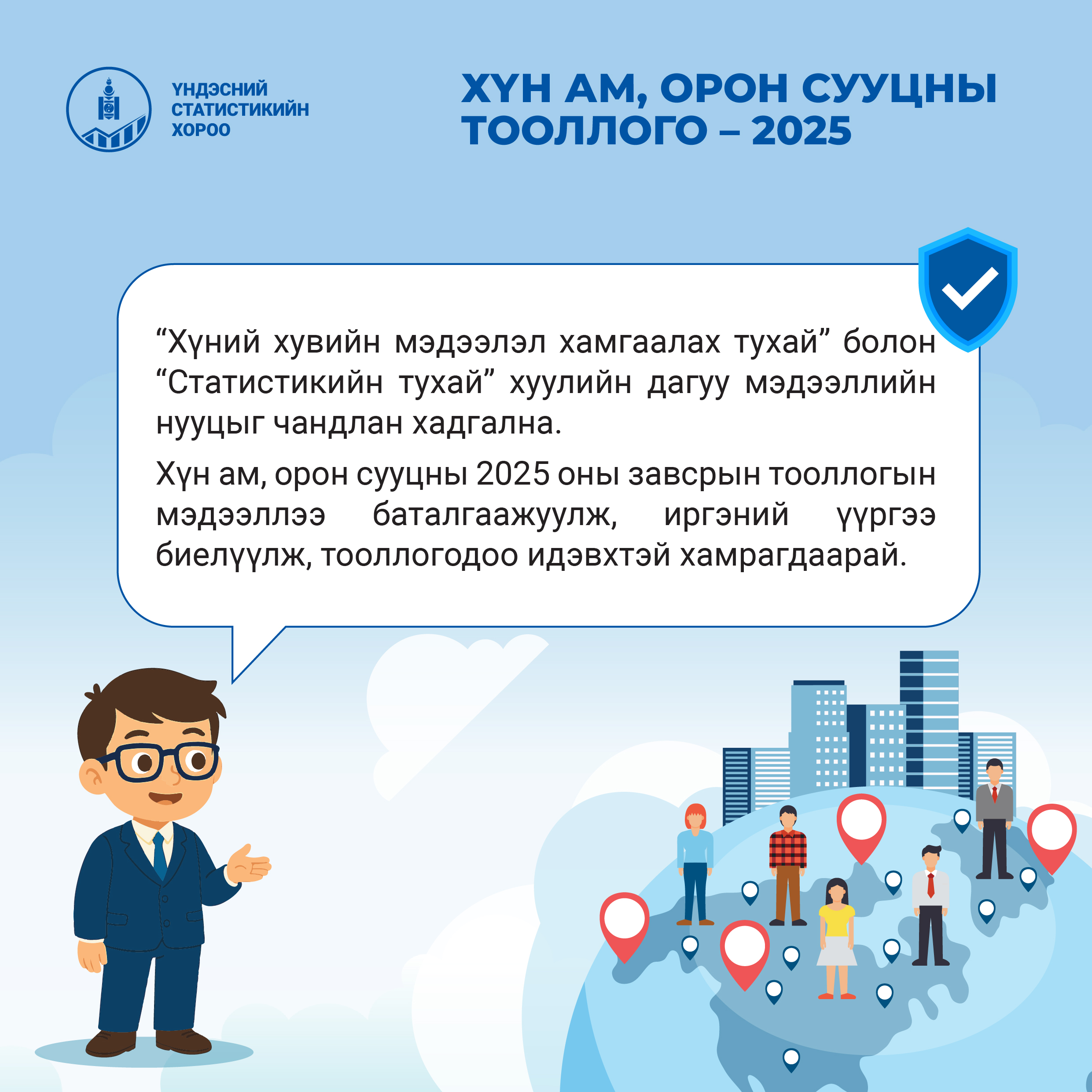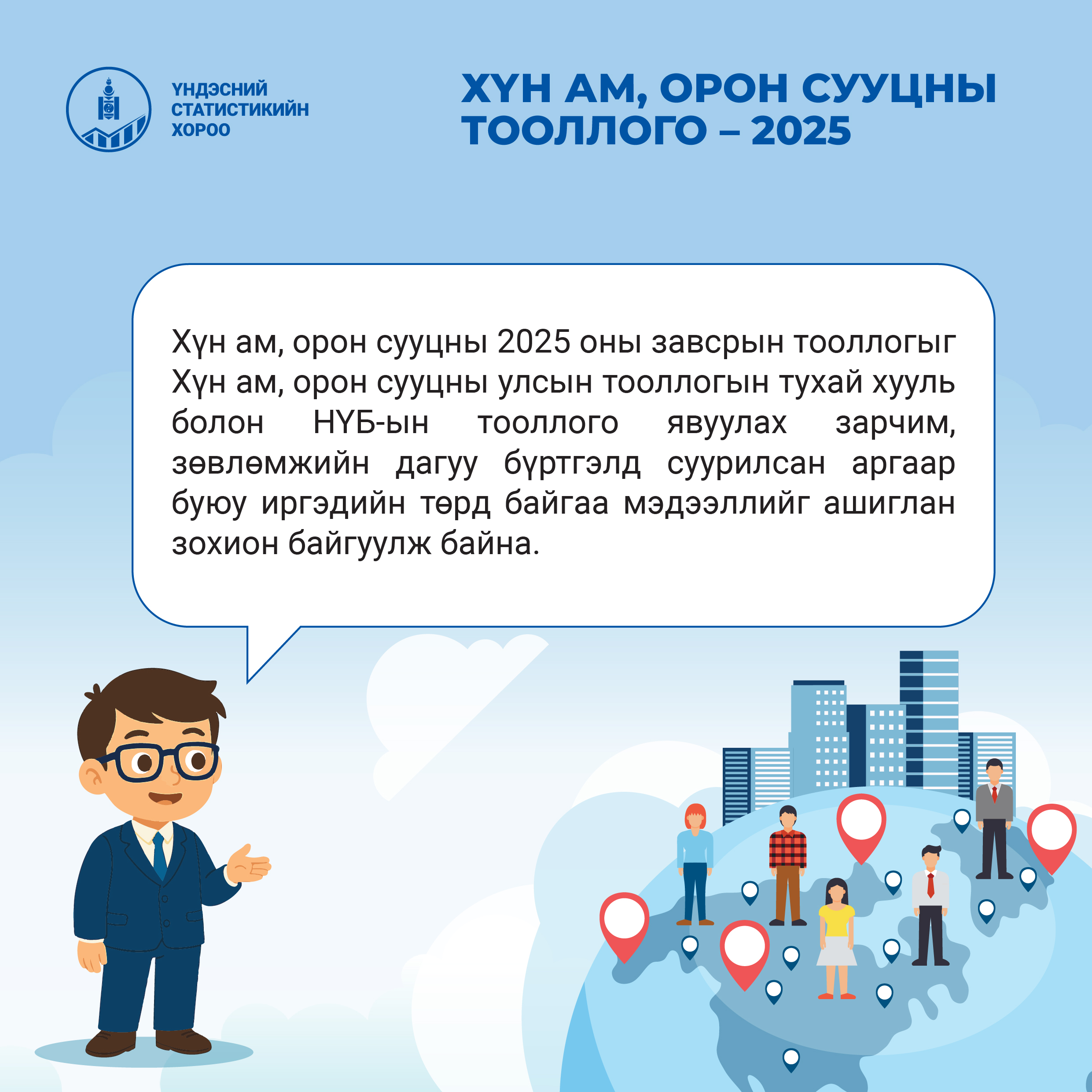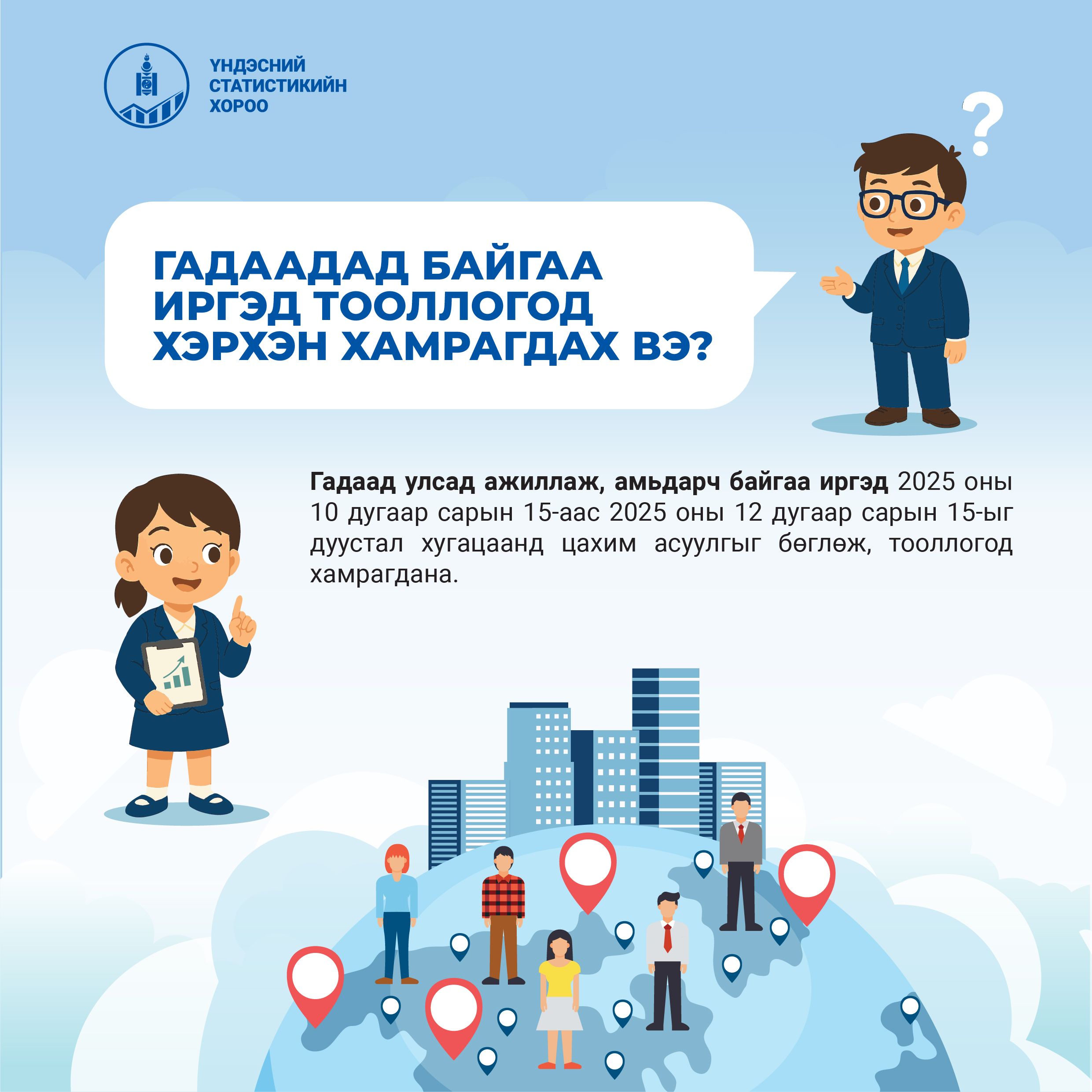 Хүн ам, орон сууцны тооллогын тухай хуулийн дагуу Хүн ам, орон сууцны завсрын тооллого 2025 оны 12 дугаар сарын 15-ны өдрийг хүртэл явагдаж байна. Завсрын ээлжит тооллогод хилийн чанад аж төрж буй иргэд Та бүхэн цахим бүртгэлийн системээр дамжуулан тооллогод хамрагдах юм.